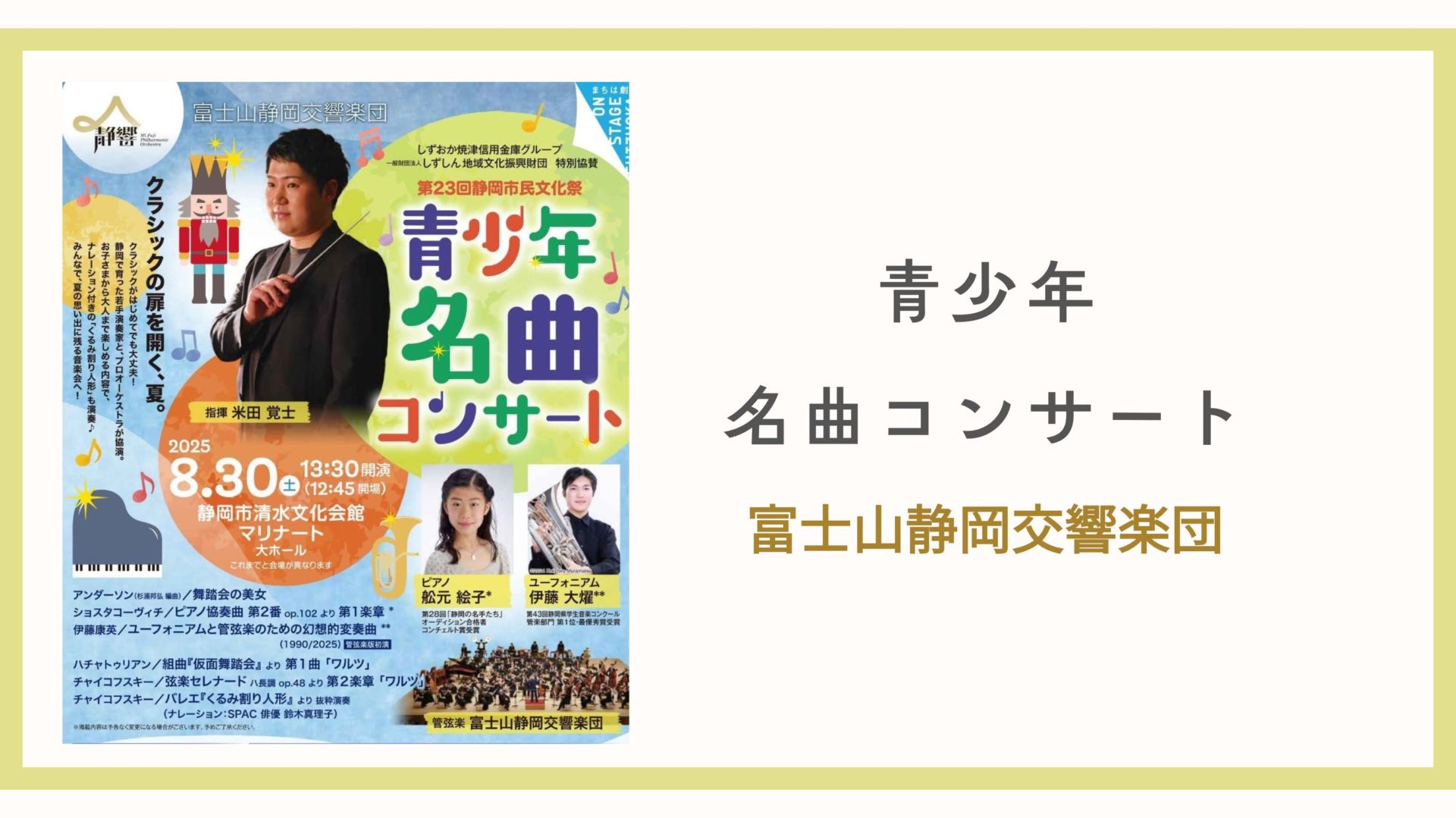 先日、富士山静岡交響楽団「青少年名曲コンサート」(8月30日、静岡市清水文化会館マリナート)を聴きに行きました。